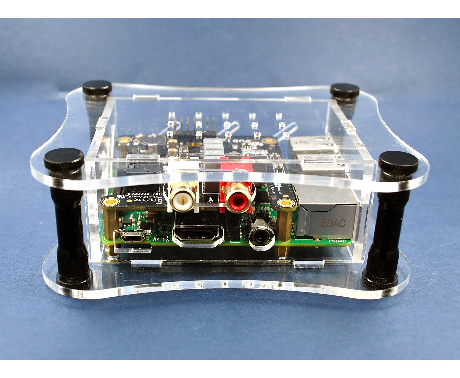Acrylic Case for Raspberry Pi + Piano. Available in clear and black options with black and silver standoffs.